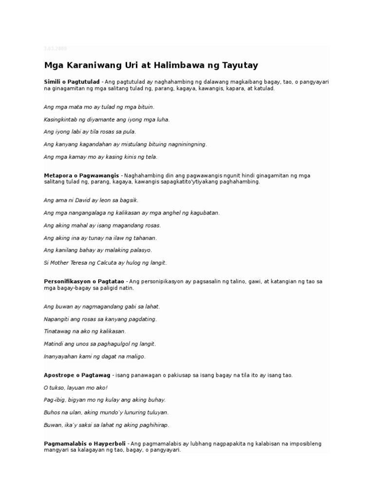 Jun 28 2014 Mga Uri ng Tayutay 2. O tukso layuan mo ako. Mga Karaniwang Uri at Halimbawa ng ng tao bagay o pangyayari.