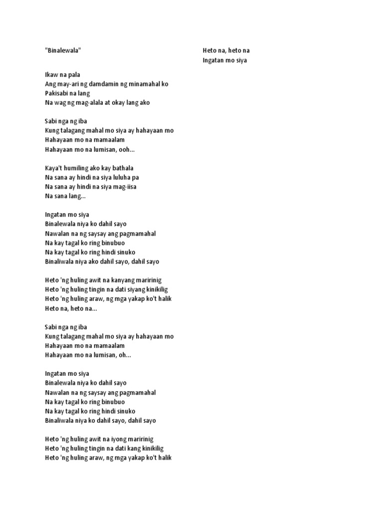 Kung talagang mahal mo siya ay hahayaan mo Hahayaan mo na mamaalam Hahayaan mo na lumisan oh Ingatan mo siya Binalewala niya ko dahil sayo Nawalan na ng saysay ang pagmamahal Na kay tagal ko ring binubuo Na kay tagal ko ring hindi sinuko Binalewala niya ko dahil sayo dahil sayo Heto ng huling awit na iyong maririnig.