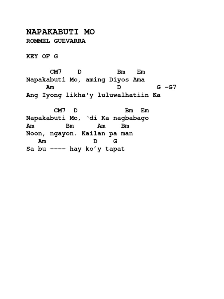 Jun 12 2018 Napakabuti Mo Easy Guitar Chords. Feb 09 2021 KAY BUTI-BUTI MO PANGINOON Verse D Fm Bm Kay buti-buti mo Panginoon G A Sa lahat ng oras G A Sa bawat araw D Fm Bm Ikay laging tapat kung magmahal G. Its a Tagalog song by Rommel Guevarra.