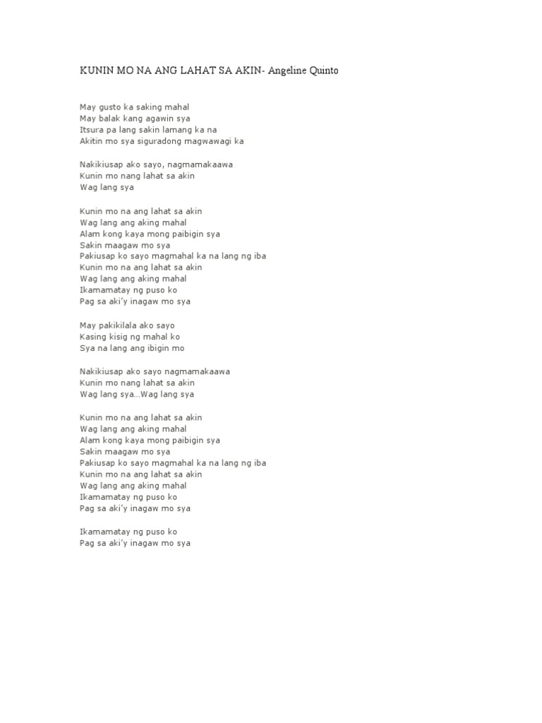 Aking pagmamahal sana namay maramdaman. Translation of Kunin mo na Ang Lahat sa Akin by Jeremiah from FilipinoTagalog to Japanese Version 2 Deutsch English Espaol Franais Hungarian Italiano Nederlands Polski Portugus Brasil Romnă Svenska Trke Ελληνικά Български Русский Српски العربية فارسی 日本語 한국어. Pag sa akin inagaw mo siya May pakikilala ako sayo kasing kisig ng mahal ko Sya na lang ang ibigin mo Nakiki-usap ako sayo nagmamaka-awa Kunin mo na ang lahat sa akin Wag lang siya Kunin mo na ang lahat sa akin Wag lang ang aking mahal Alam kong kaya mong paibigin siya Sakin maagaw mo siya Pakiusap ko sayo magmahal ka na lang ng iba Kunin mo.
